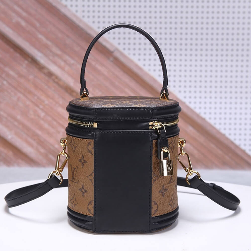 Designer Nicolas Ghesqui??re reworks the classic shape of the LV Cannes beauty case, a masterpiece infused with the House?s heritage, to create the Cannes handbag. This petitely proportioned bag is fashioned in Monogram and Monogram Reverse coated canvas. It can be carried in a variety of ways by means of its top handle and a removable leather strap.