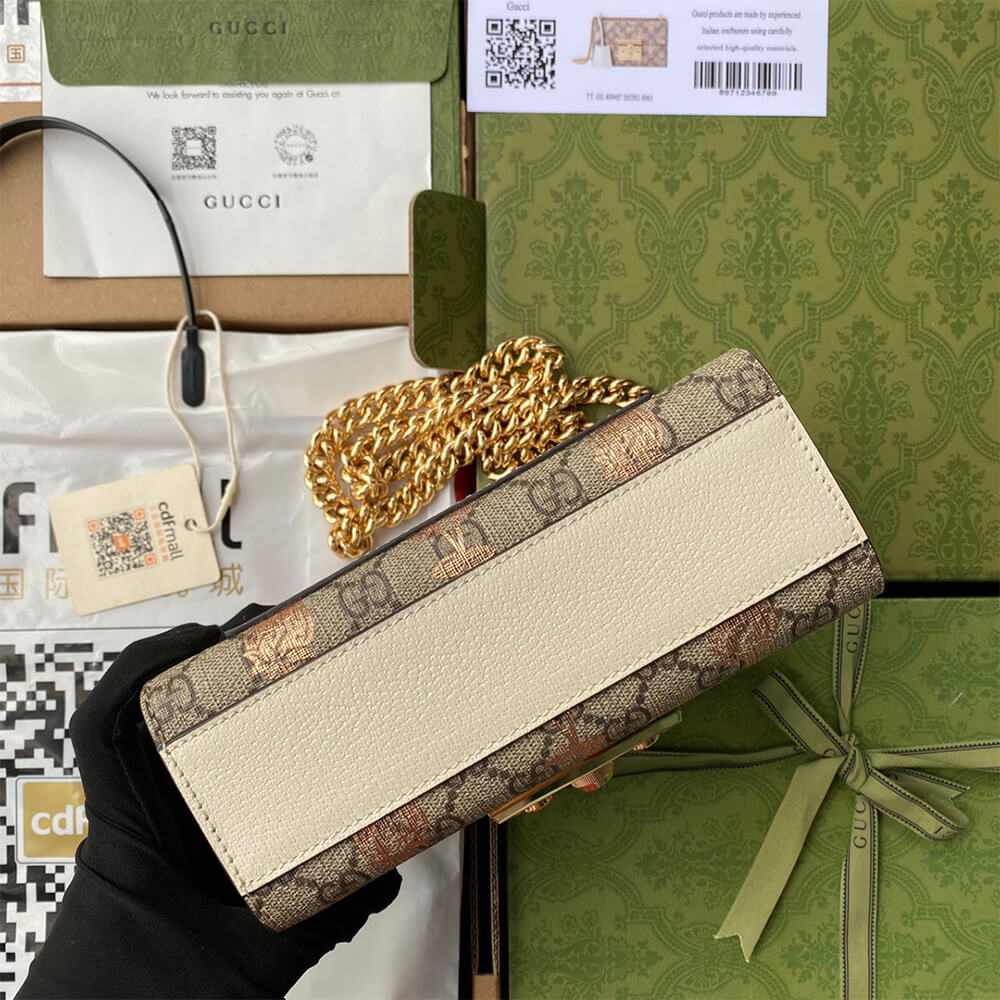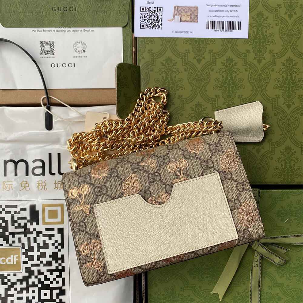 Beige and ebony GG Supreme canvas with metallic cherry and strawberry print, a material with low environmental impact